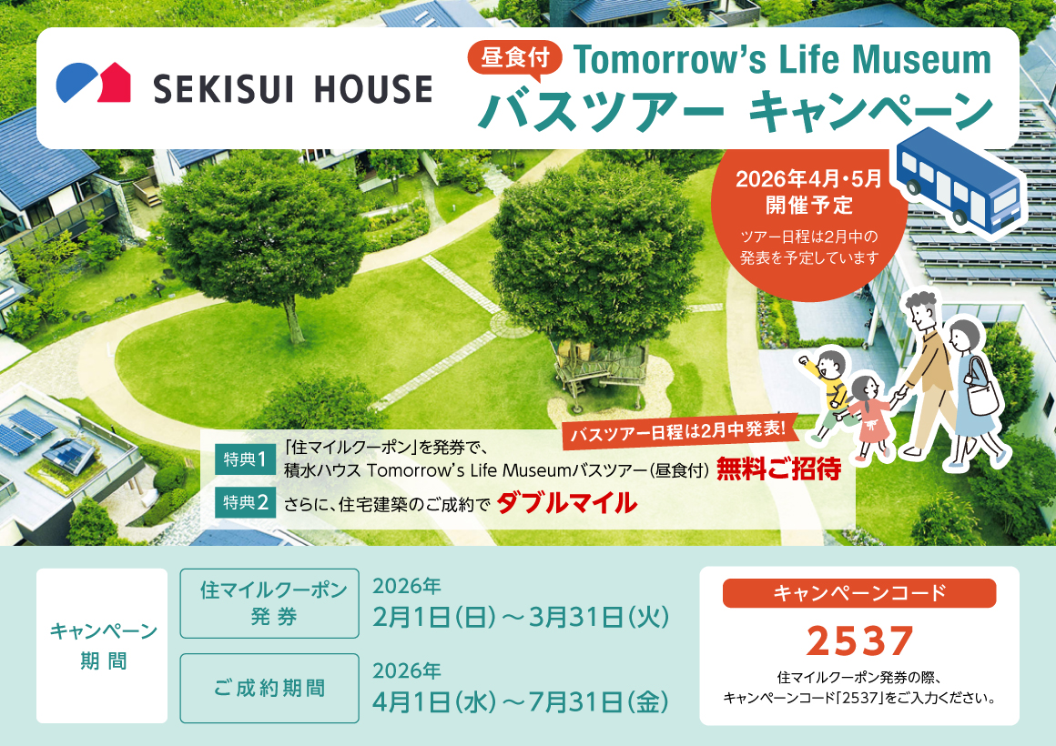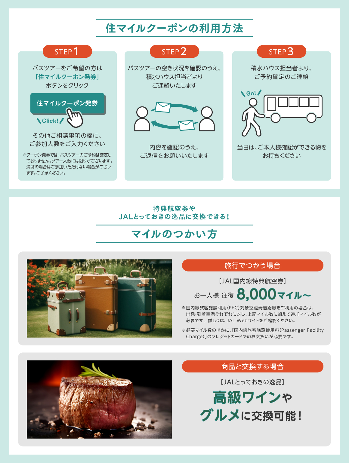 - ※住マイルクーポン発券後、バスツアーの空き状況を確認のうえ、積水ハウス担当者よりご連絡をいたします。内容をご確認のうえ、返信をお願いいたします。その後、積水ハウス担当者よりバスツアーご予約確定のご連絡をいたします。