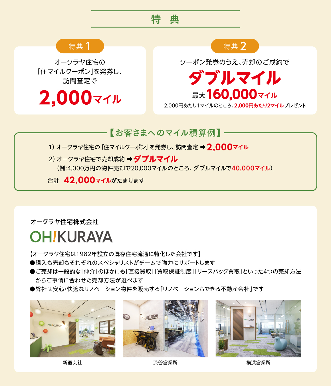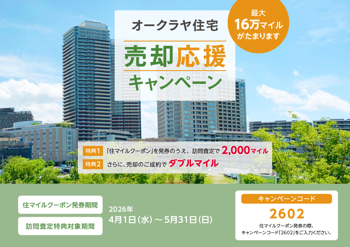 - ※訪問査定2,000マイルの積算条件は、訪問査定のみが対象となります(訪問査定とは、室内をオークラヤ住宅社員が拝見し、価格を提示することです。電話等による簡易査定は含まれません)。