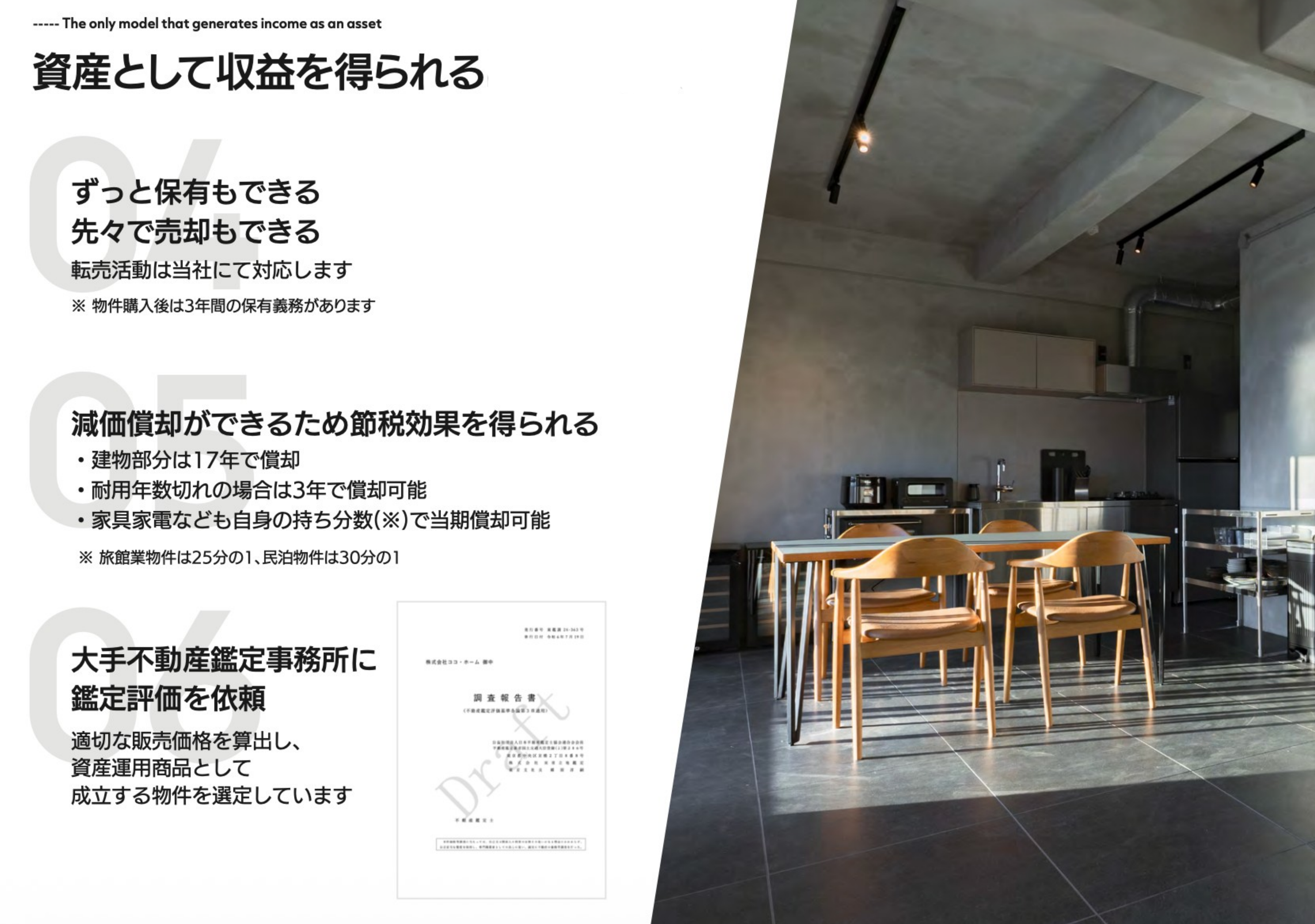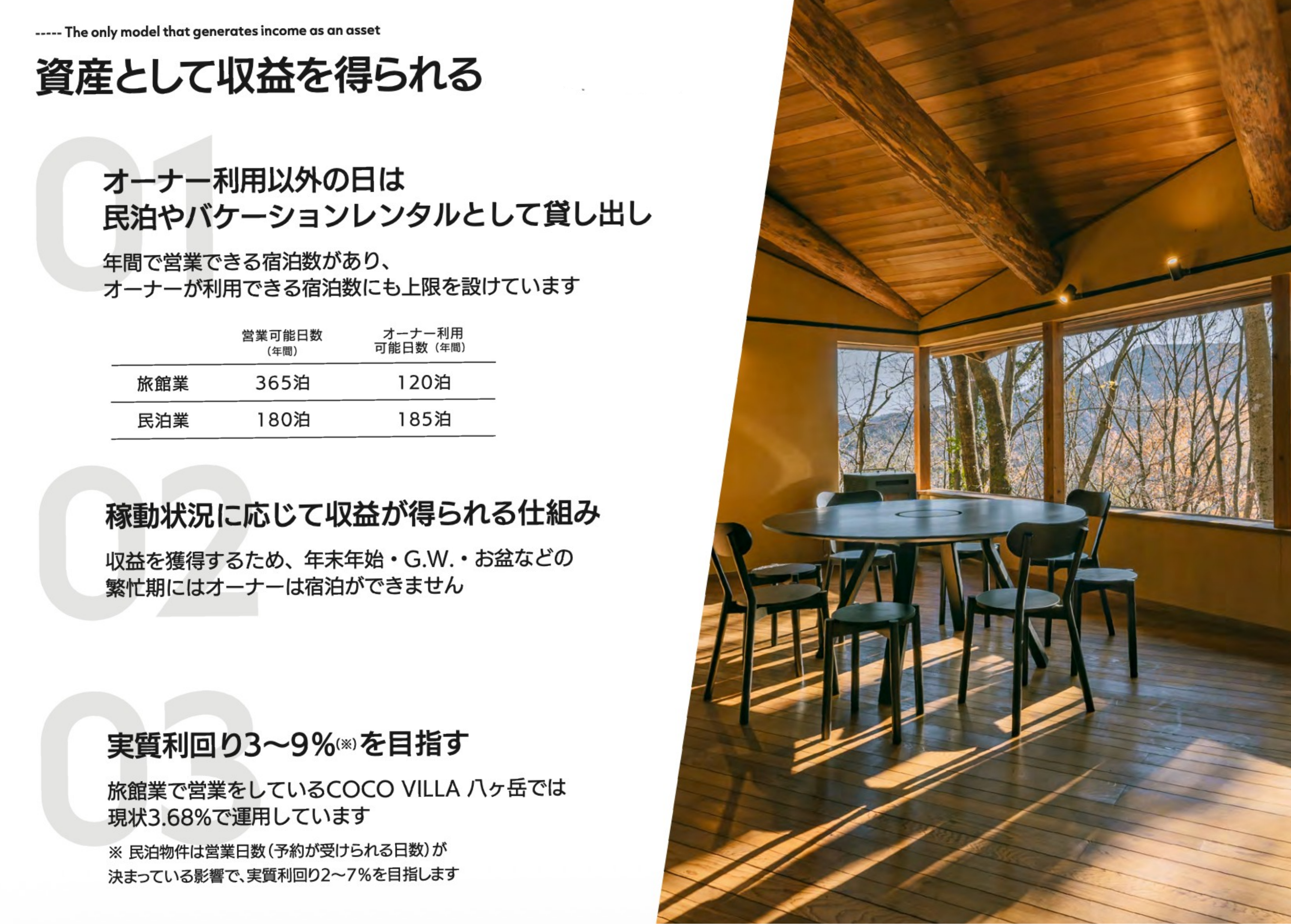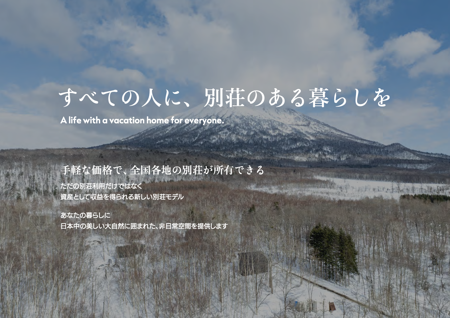 「別荘は高い・維持コストと手間がかかる」という常識を変え、「使える×収益」を両立する新しい別荘の持ち方を提案しています。