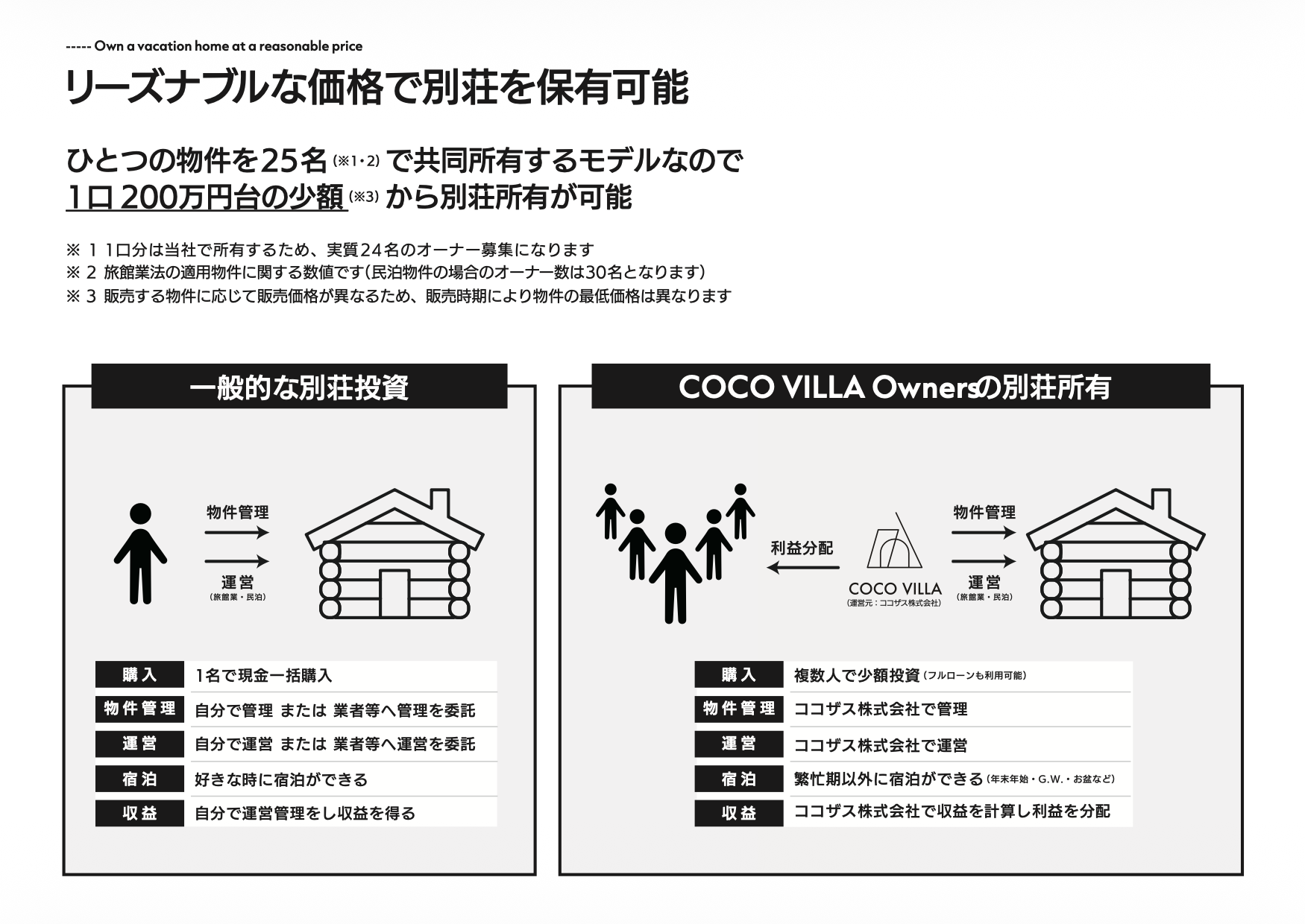 日本全国の自然豊かなロケーションに展開する貸別荘を「共同所有」することで、200万円台から別荘を“資産”として保有できる新しい別荘所有モデルです。