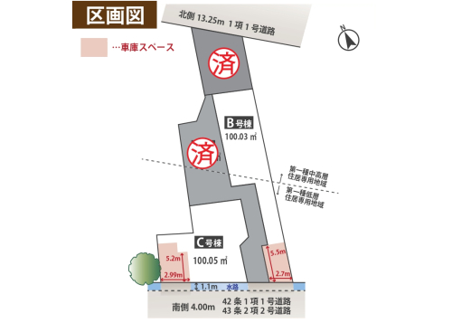 【物件概要】用途地域:第一種中高層・第一種低層住居専用地域、建ぺい率:40・60%、容積率:80・160%、構造階建て:木造2階建て、木造3階建て、法令上の制限:準防火地域、第一種高度地区、土地権利:所有権、接道:南側4.0m、完成予定日:2025年2月、引渡:相談