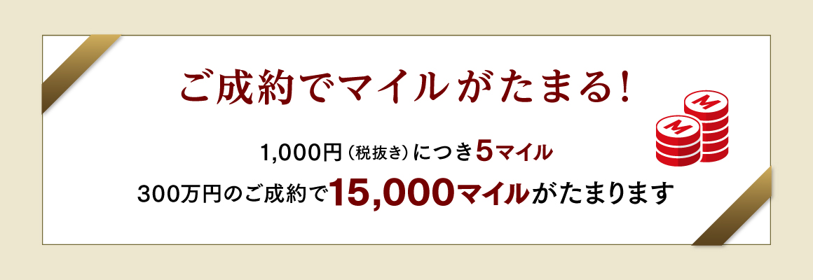 - ※成約特典マイルの積算は、お客さま1組様につき1回限りとなります。